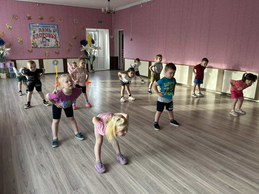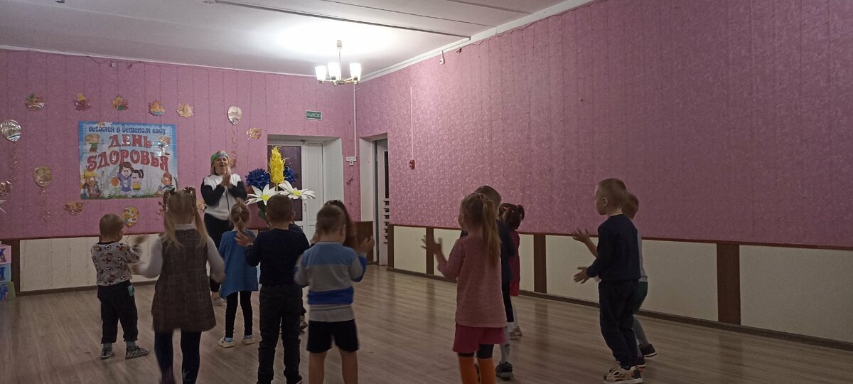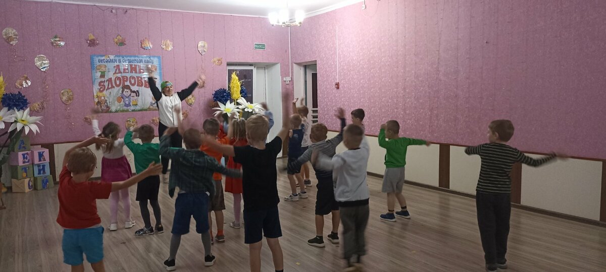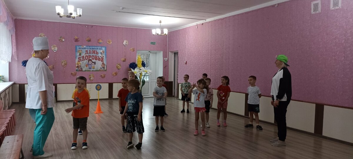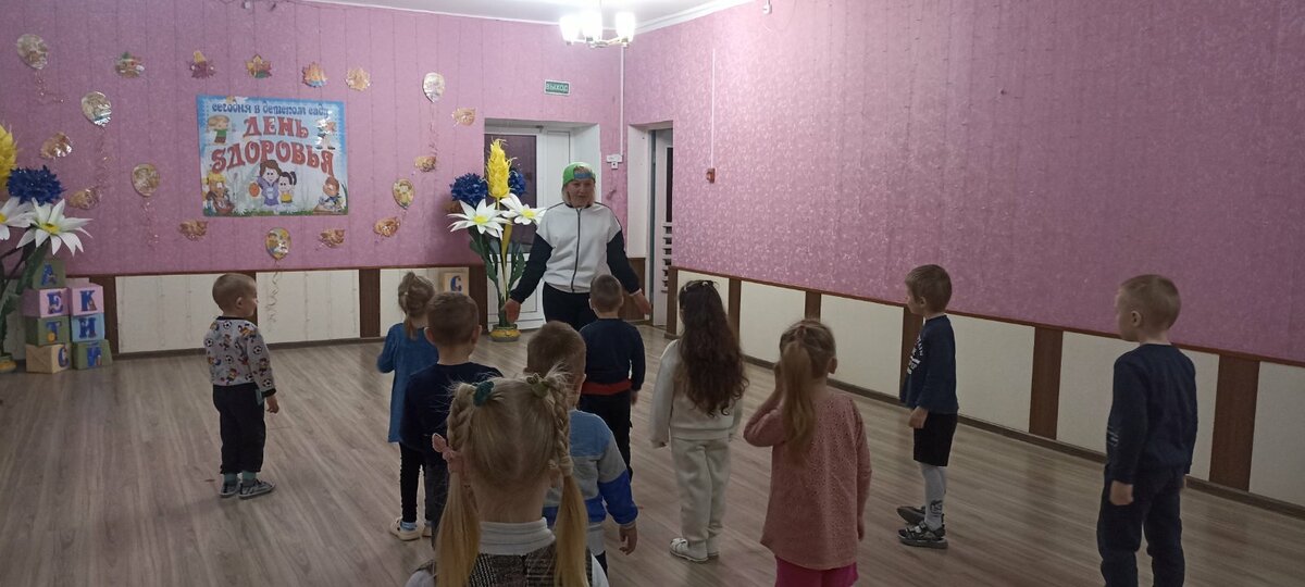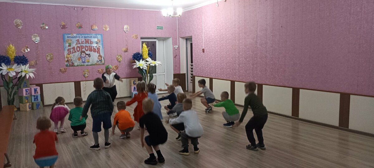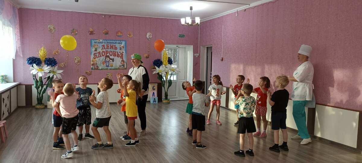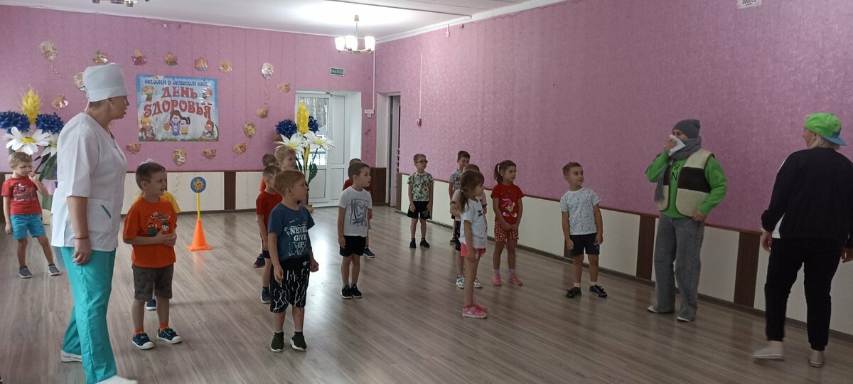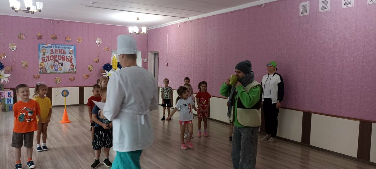 В детском саду прошел День здоровья. Утром воспитанников встречал Закаляйкин, который провёл с ребятами утреннюю зарядку. После завтрака ребята старшей группы снова встретились в зале Закаляйкиным, где прошёло физкультурное развлечение "День доровья". Ребята закрепили представлени о том, что каждый человек должен сам заботиться о своём здоровье с детства, а также развивать быстроту, силу, ловкость, выносливость, что повышает защитные силы организма, уточнили знания о необходимости наличия витаминов в организме человека, и роли спорта и физических упражнений в сохранении здоровья человека. Также ребята отработали умение работать в команде.