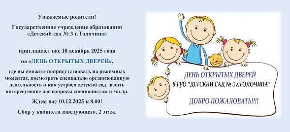 День открытых дверей прошел в ГУО "Детский сад № 3 г.Толочина" для родителей воспитанников. Представители родительских комитетов групп пришли, чтобы ознакомиться с работой учреждения, задать спорные и интересующие их вопросы, принять участие в открытых занятиях, проводимых в этот день. Согласно разработанному плану - утро у гостей было весьма насыщенным.