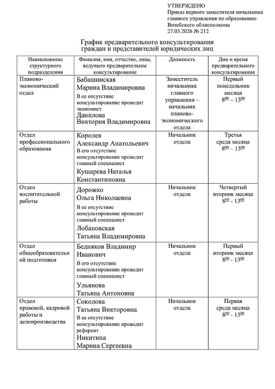 График личного приёма граждан и представителей юридических лиц руководством главного управления по образованию Витебского облисполкома